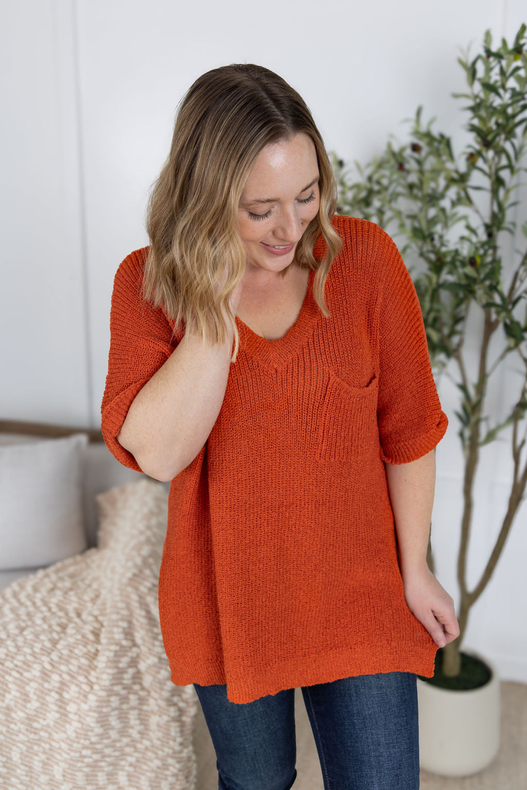 Get cozy with our Annie Open Knit Top in Pumpkin! The perfect combination of comfort and style, this top features side slits and a v-neck for a trendy look and a convenient breast pocket and cuff sleeves. Lounge in style with this must-have addition to your wardrobe.