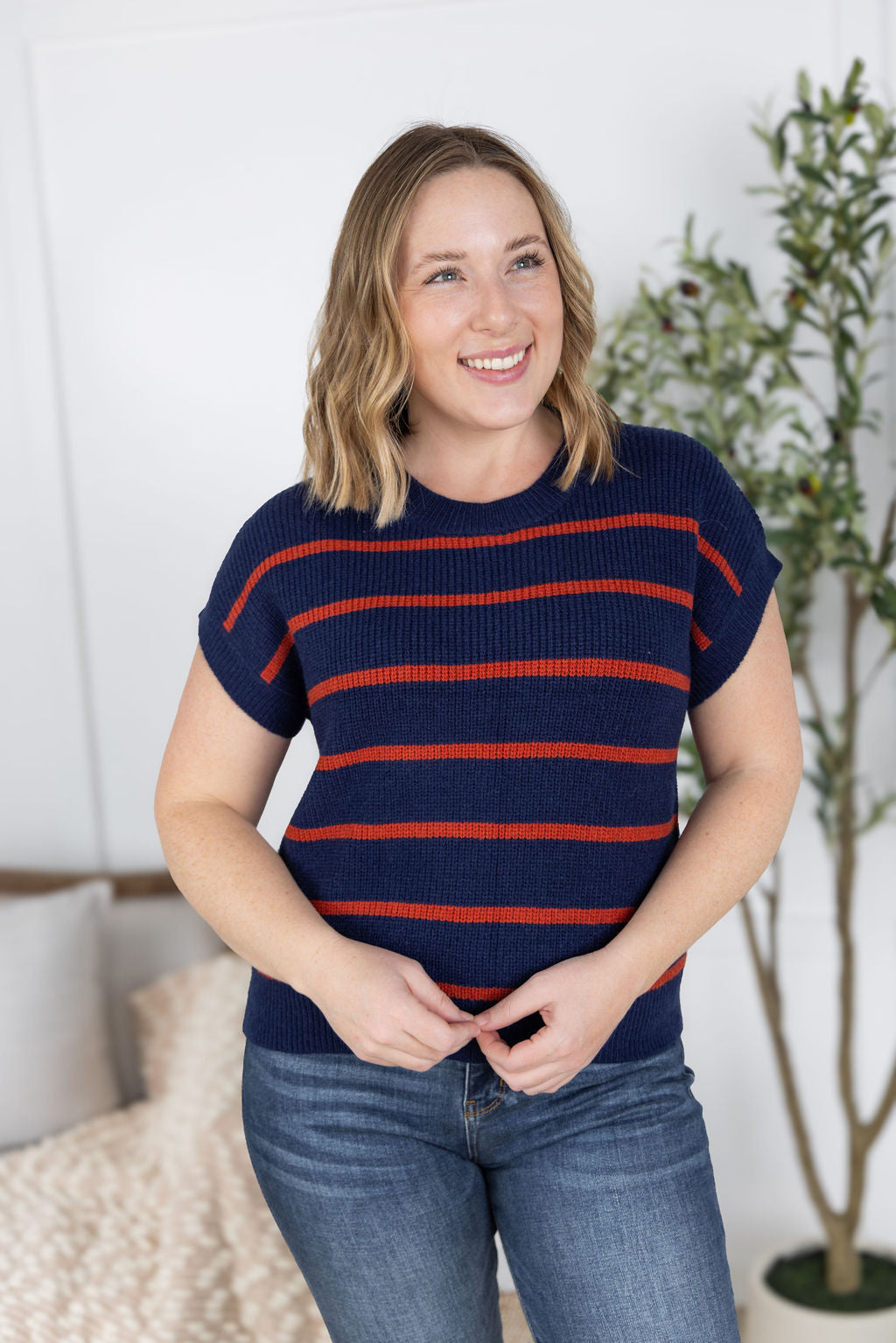 Get cozy this fall with our Striped Sweater Top. Made with a soft fabric and featuring a round neckline, it's perfect for pairing with jeans or dress pants. Stay stylish and comfortable all season long with this must-have piece in classic navy and pumpkin stripes.