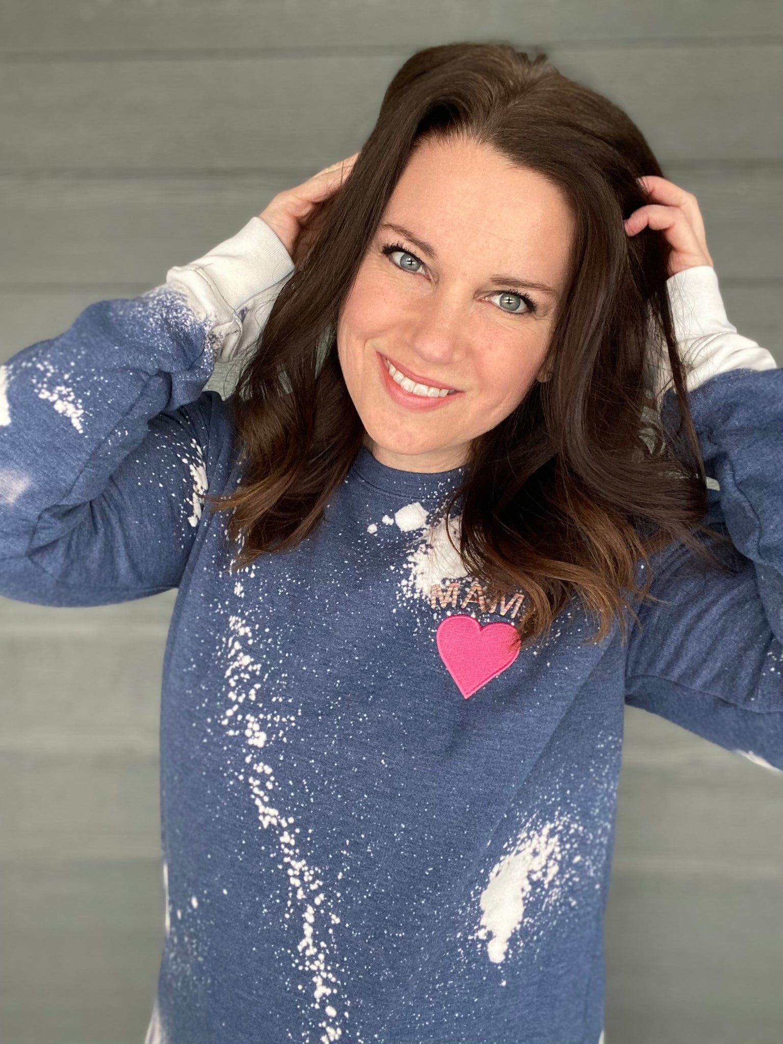 For all the Mama’s out there. Super soft fleece lined denim bleached pullover with a pretty embroidery heart and rainbow Mama on it. Unisex sizing. The model is wearing a size small.